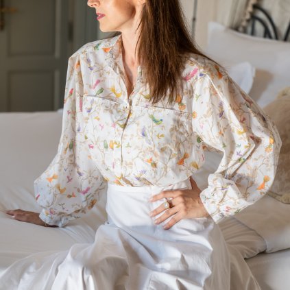 Lehké a vzdušné pyžamo ze 100% prvotřídní saténové bavlny ve dvou barevných variantách - čistě bílé s vyšitým logem Chateau Mcely nebo v bílé barvě s motivem Mystic Birds s barevnou paspulkou, potaženými knoflíčky, s manžetami na rukávech i kalhotách s pohodlnými kapsami podle návrhu Inéz Cusumano, majitelky Chateau Mcely a autorky příběhu o těchto tajemných ptáčcích. Možnost nosit nejen jako pyžamo, ale také jako letní oblečení na doma i na ulici.