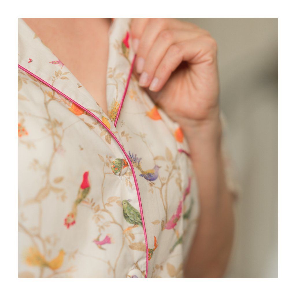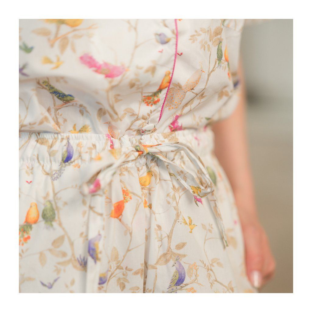 Lehké a vzdušné pyžamo ze 100 % prvotřídního bavlněného voálu v bílé barvě s motivem Mystic Birds s barevnou paspulkou, potaženými knoflíčky, s manžetami na krátkých rukávech i šortkách s pohodlnými kapsami podle návrhu Inéz Cusumano, majitelky Chateau Mcely a autorky příběhu o těchto tajemných ptáčcích.